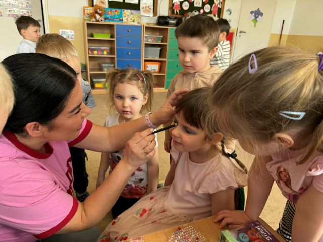 W dniu dzisiejszym grupę Maki odwiedziła mama Rozalki, która pracuje jako makijażystka. Pani Asia opowiedziała dzieciom o swoim zawodzie oraz pokazała różne akcesoria i kosmetyki używane do wykonywania makijażu.
