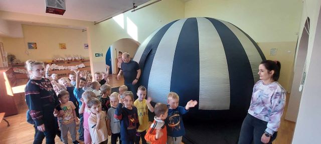 W naszym przedszkolu gościło mobilne kino sferyczne. Dzieci miały niepowtarzalną okazję obejrzeć film wewnątrz kopuły w technice 3D. To były niezapomniane wrażenia. Fotorelacja z tego wydarzenia jest dość skromna ponieważ w ciemnej kopule nie było możliwości zrobienia większej ilości zdjęć, za to w pamięci dzieci na pewno pozostaną niesamowite wspomnienia.