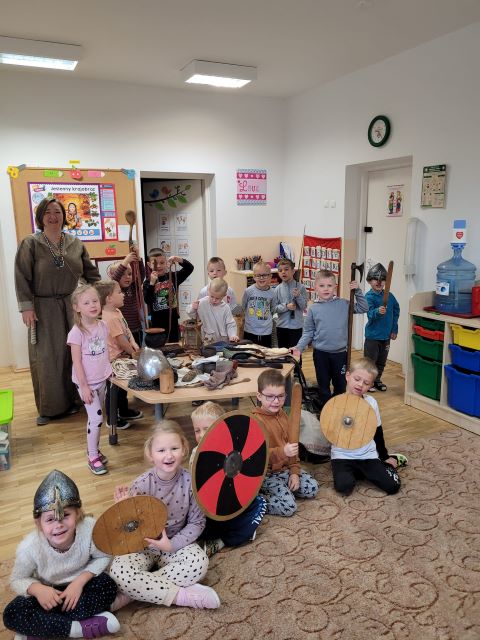 Grupę "Niezapominajki" odwiedziła dziś mama Jeremiasza Pani Agnieszka opowiadała nam o Drużynie Wikingów NIDHOGG z Braniewa do której należy. Dzieci mogły zobaczyć przedmioty jakie towarzyszyły ludziom w X wieku. Po zajęciach dzieci wysłuchały bajeczki czytanej przez Panią Agnieszkę .Za miło spędzony czas DZIEKUJEMY