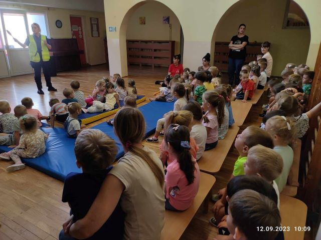 Ważnym wydarzeniem dla naszych przedszkolaków była wizyta policjantki z Komendy Powiatowej Policji. Tematem numer jeden było bezpieczeństwo dzieci na drogach, lecz nie obyło się bez wielu pytań maluchów dotyczących codziennej pracy policjanta.