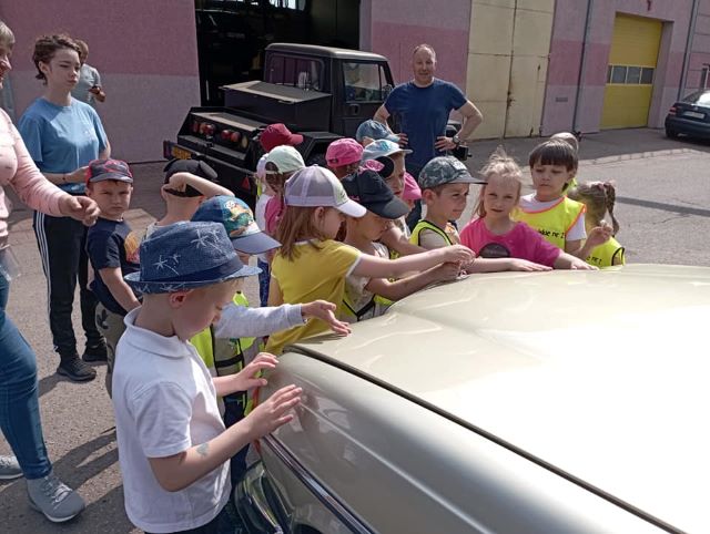 Wizyta w warsztacie samochodowym "Koniczynek" miała na celu zapoznanie przedszkolaków z zawodem mechanika samochodowego oraz uwrażliwienie ich na przestrzeganie zasad bezpieczeństwa podczas jazdy samochodem.