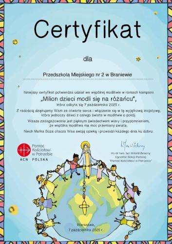 Milion dzieci modli się na różańcu.W miesiącu październiku przedszkolaki włączyły się w piękną, ogólnoświatową akcję „Milion dzieci modli się na różańcu”.Wspólnie modliliśmy się za pokój na świecie, za nasze rodziny i wszystkich ludzi.Dzieci z ogromnym zaangażowaniem i prostotą serca trzymały w rączkach różaniec, ofiarowując swoją modlitwę w intencji pokoju i dobra.